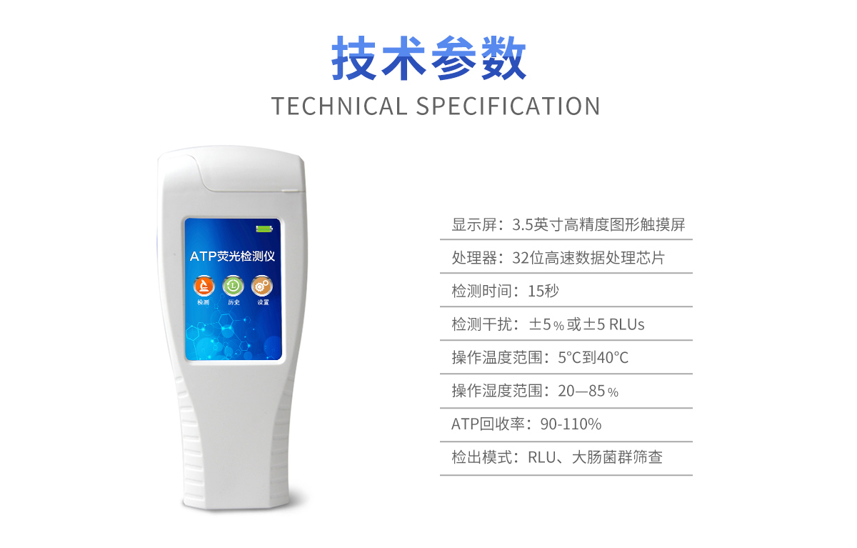 該設備采用生物化學反應方法檢測ATP含量,潔凈度檢測儀基于螢火蟲發光原理,利用“熒光素酶—熒光素體系”快速檢測三磷酸腺苷(ATP)。ATP拭子含有可以裂解細胞膜的試劑,能將細胞內ATP釋放出來,與試劑中含有的特異性酶發生反應,產生光,再用熒光照度計檢測發光值,微生物的數量與發光值成正比,由于所有生物活細胞中含有恒量的ATP,所以ATP含量可以清晰地表明樣品中微生物與其他生物殘余的多少,用于判斷衛生狀況。
