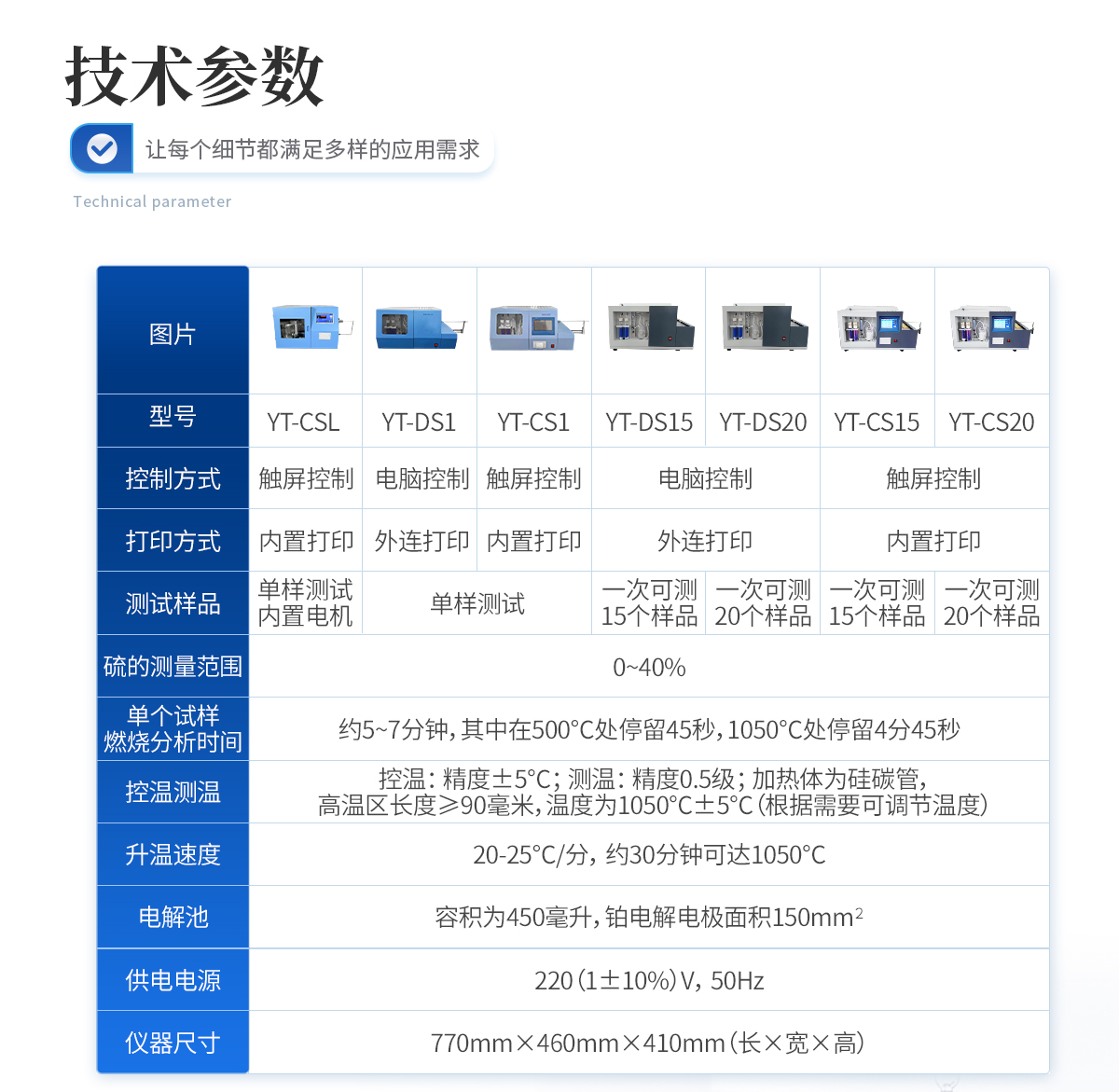 | 1.硫的測量范圍:0—40%. | 2.單個(gè)試樣燃燒分析時(shí)間:約5--7分鐘,其中在500℃處停留45秒,1050℃處停留4分45秒。 | 3.控溫:精度±5℃。測溫:精度0.5級;加熱體為硅碳管,高溫區(qū)長度≥90毫米,溫度為1050℃±5℃(根據(jù)需要可調(diào)節(jié)溫度) | 4、 密度:如下表規(guī)定: St,% 重復(fù)性St,ad,% 再現(xiàn)型St,d,%<1 1="" 0.05="" 0.10="">4 0.20 0.30 | 5.升溫速度:20--25℃/分,約30分鐘可達(dá)1050℃。 | 6.電解池:容積為450毫升,鉑電解電極面積150mm2 。 | 7.供電電源:220(1±10%)V,50Hz. | 8.儀器尺寸(mm) 長×寬×高(770×460×410) |