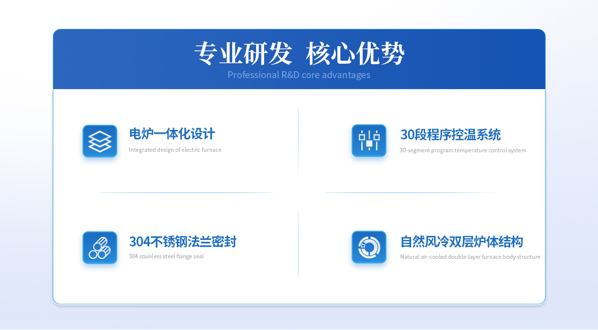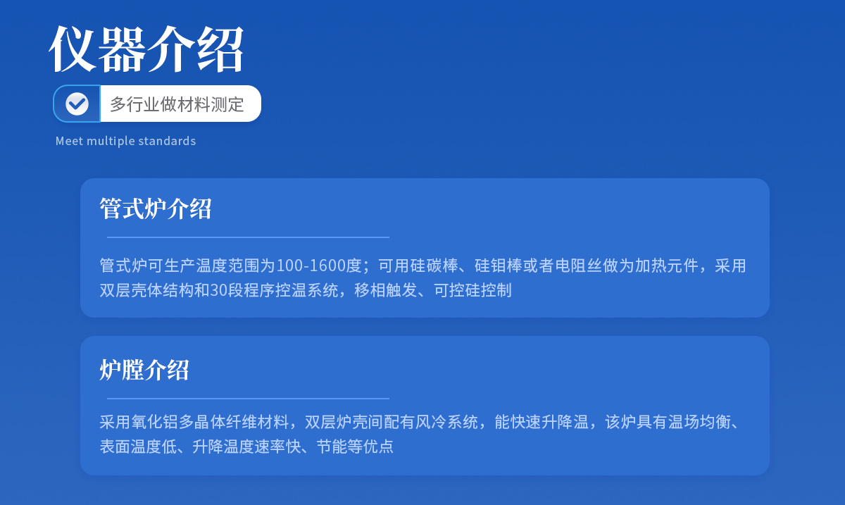 | 1、爐膛采用優(yōu)質氧化鋁纖維材料,保溫性能好,耐用,拉伸強度高,無雜球,純度高,節(jié)能效果明顯; | 2、加熱元件采用優(yōu)質HRE電阻絲,大大提高了其使用壽命; | 3、超溫報警,漏電保護,操作安全可靠。 |