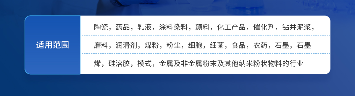 YT-JLGS-2000廣泛應用于水泥、陶瓷、藥品、乳液、涂料、染料、顏料、填料、化工產品、催化劑、鉆井泥漿、磨料、潤滑劑、煤粉、泥砂、粉塵、細胞、細菌、食品、添加劑、農藥、炸藥、石墨、感光材料、燃料、墨汁、金屬與非金屬粉末、碳酸鈣、高嶺土、水煤漿及其他粉狀物料。