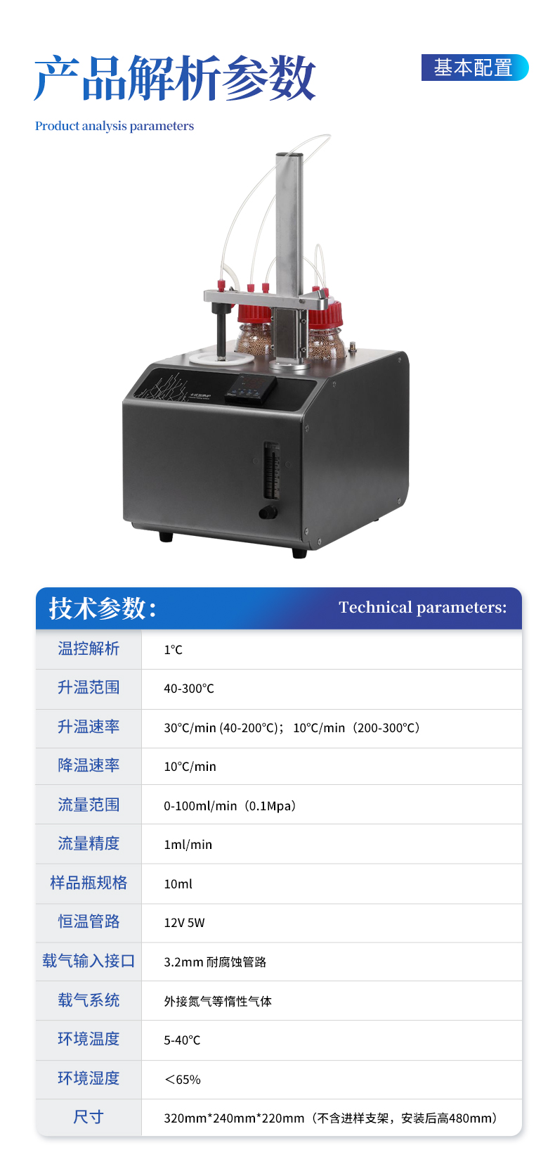 | 型號:YT-KSL | 溫控解析:1℃ | 升溫范圍:40-300℃ | 升溫速率:30℃/min (40-200℃); 10℃/min(200-300℃) | 降溫速率:10℃/min | 流量范圍:0-100ml/min(0.1Mpa) | 流量精度:1ml/min | 樣品瓶規(guī)格:10ml | 恒溫管路:12V 5W | 載氣輸入接口:3.2mm 耐腐蝕管路 | 載氣系統(tǒng):外接氮氣等惰性氣體 | 環(huán)境溫度:5-40℃ | 環(huán)境濕度:<65% | 尺寸:320mm*240mm*220mm(不含進(jìn)樣支架,安裝后高480mm) |