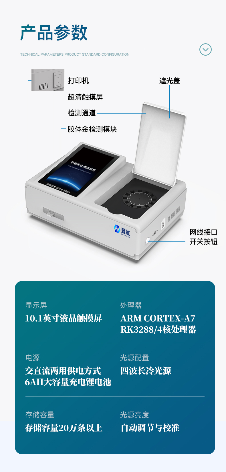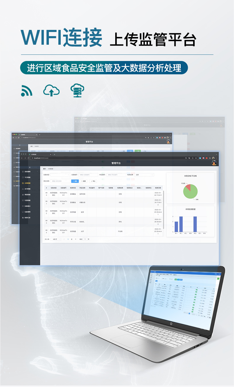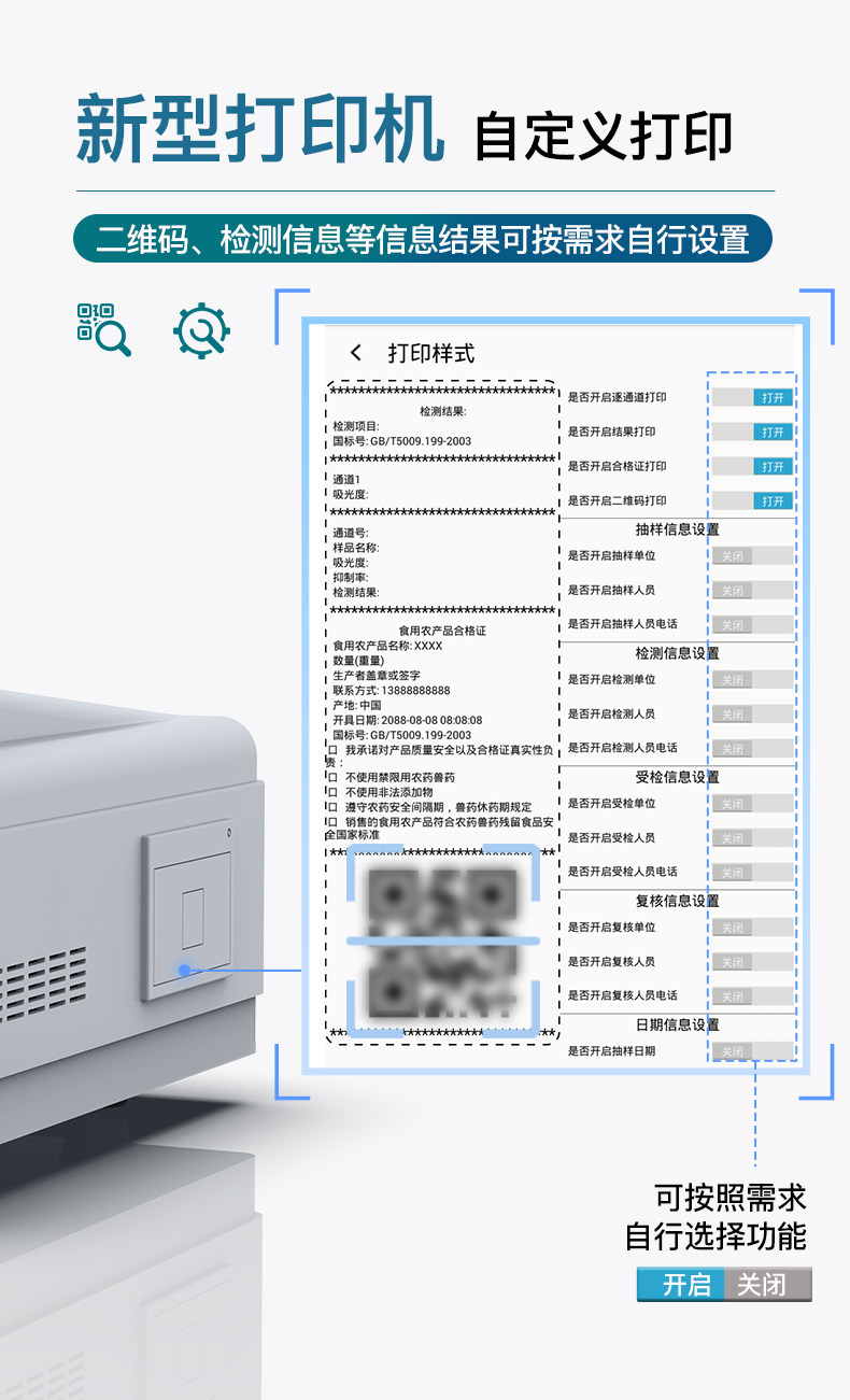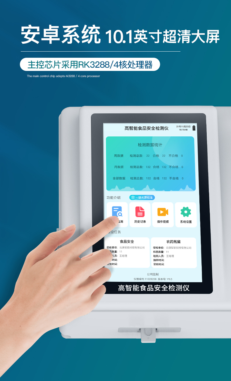 | 儀器采用手提式一體化系統(tǒng)檢測(cè)技術(shù),將分光光度模塊、數(shù)字化管理模塊、無線通訊模塊高度集成于一體,支持檢測(cè)200種食品安全檢測(cè)項(xiàng)目,同時(shí)預(yù)留升級(jí)檢測(cè)方法。 | 儀器檢測(cè)模塊標(biāo)準(zhǔn)化、智能化,檢測(cè)項(xiàng)目可隨意自由組合。檢測(cè)箱體內(nèi)置多個(gè)標(biāo)準(zhǔn)檢測(cè)單元,檢測(cè)模塊可以調(diào)整配置。 | 顯示屏幕:儀器采用10.1英寸豎向液晶觸摸屏顯,搭配運(yùn)行安卓智能操作系統(tǒng),主控芯片采用ARM Cortex-A7,RK3288/4核處理器,主頻1.88Ghz,操作方便,性能更強(qiáng)。 | 檢測(cè)通道:≥12通道;采用精密旋轉(zhuǎn)比色池設(shè)計(jì),使用同芯片同光源校準(zhǔn)精度,解決不同光源之間的誤差值,更加準(zhǔn)確**。(1-12通道間誤差0.1%,***:**202022821055.2) | 儀器光源:高精度進(jìn)口四波長(zhǎng)冷光源,每個(gè)通道均配置 410、520、590、630nm 波長(zhǎng)光源,標(biāo)配**的光路切換裝置,專利光路切換功能可實(shí)現(xiàn)64波長(zhǎng),并且所有檢測(cè)項(xiàng)目可實(shí)現(xiàn)所有通道同時(shí)檢測(cè)。 | 設(shè)備可一鍵校準(zhǔn),自動(dòng)保存校準(zhǔn)數(shù)據(jù),自動(dòng)對(duì)比校驗(yàn),得到精準(zhǔn)光源,采用Android SP存儲(chǔ)數(shù)據(jù),光源數(shù)據(jù)永不丟失,方便每一次使用。 | 通訊接口:配備無線通信模塊、可選配4G(APN)通訊模塊和藍(lán)牙傳輸,同時(shí)具有雙USB接口以及RJ45網(wǎng)線接口,可以多方式實(shí)現(xiàn)數(shù)據(jù)保存及數(shù)據(jù)傳輸。 | 存儲(chǔ)方式:支持U盤存儲(chǔ),標(biāo)準(zhǔn)USB接口,免驅(qū)動(dòng)安裝。檢測(cè)結(jié)果存儲(chǔ)容量20萬條以上,可生成Excel表格進(jìn)行拷貝,并具有登錄保護(hù)功能。 | 智能化操作系統(tǒng): | 1)操作系統(tǒng):儀器可在同一檢測(cè)界面自動(dòng)對(duì)應(yīng)相關(guān)檢測(cè)通道,一次性選擇1-12個(gè)樣品名稱,無需退出界面,節(jié)省操作時(shí)間。并可以對(duì)每個(gè)通道屬性和樣品信息單獨(dú)進(jìn)行編輯,例如送檢單位、人員,檢測(cè)人員等,打印時(shí)勾選打印顯示。 | 2)數(shù)據(jù)集成系統(tǒng):設(shè)備首頁(yè)自動(dòng)匯總分析檢測(cè)數(shù)據(jù),包含:周檢測(cè)數(shù)據(jù)、月檢測(cè)數(shù)據(jù),全部檢測(cè)總數(shù)量,均包含檢測(cè)總數(shù),合格數(shù),不合格數(shù),以及相關(guān)柱形分析圖,各項(xiàng)檢測(cè)數(shù)據(jù)一目了然,無需電腦查詢,更加快捷直觀。 | 3)數(shù)據(jù)庫(kù)系統(tǒng):十幾項(xiàng)數(shù)據(jù)庫(kù)分類管理儀器:包含項(xiàng)目類型、項(xiàng)目數(shù)據(jù)、檢測(cè)數(shù)據(jù)、歷史記錄、國(guó)標(biāo)信息、曲線信息、采樣信息、檢測(cè)信息、受檢信息、復(fù)核信息、圖表信息、光源校準(zhǔn)信息、打印樣式信息、樣品庫(kù)信息等等,數(shù)據(jù)庫(kù)之間互相協(xié)調(diào)聯(lián)動(dòng)保證數(shù)據(jù)的真實(shí)完整性。同時(shí)產(chǎn)品數(shù)據(jù)庫(kù)以及歷史檢測(cè)記錄支持一鍵檢索功能。 | 4)限量規(guī)判系統(tǒng):具有限量查詢、添加物質(zhì)合規(guī)判定系統(tǒng)。檢測(cè)出結(jié)果后,系統(tǒng)自動(dòng)調(diào)用系統(tǒng)數(shù)據(jù)庫(kù)中相關(guān)國(guó)標(biāo)進(jìn)行比對(duì)判定,客觀顯示判定結(jié)果是否合格。 | 5)項(xiàng)目預(yù)設(shè)系統(tǒng):儀器具有任務(wù)預(yù)設(shè)模塊,一鍵提前預(yù)設(shè),給出方便快捷的新檢測(cè)方案,每一個(gè)任務(wù)分別可以設(shè)置不同的樣品、批次、編號(hào)、來源、備注、抽樣信息、檢測(cè)信息、受檢信息、復(fù)核信息等更多信息。樣品送檢時(shí)一鍵調(diào)取保存信息,并可多次調(diào)取,大大提高檢測(cè)效率。 | 6)數(shù)據(jù)監(jiān)管系統(tǒng):同步對(duì)接監(jiān)管平臺(tái),數(shù)據(jù)可局域網(wǎng)和互聯(lián)網(wǎng)數(shù)據(jù)上傳,檢測(cè)結(jié)果可選擇直接傳至食品安全監(jiān)管平臺(tái)。進(jìn)行區(qū)域食品安全監(jiān)管及大數(shù)據(jù)分析處理與數(shù)據(jù)統(tǒng)計(jì),檢測(cè)區(qū)域食品安全長(zhǎng)短期動(dòng)態(tài),達(dá)到食品安全問題預(yù)估、預(yù)警。 | 7)打印系統(tǒng):內(nèi)置全新打印機(jī),新創(chuàng)自定義打印方式,可按需靈活勾選控制:產(chǎn)品合格證(國(guó)家農(nóng)業(yè)部標(biāo)準(zhǔn)要求),二維碼,抽樣信息、檢測(cè)信息,受檢信息、復(fù)核信息、抽樣日期、檢測(cè)日期等信息的打印。 | 供電模式:儀器交直流兩用,直流12V供電,可連接車載電源,可配6ah大容量充電鋰電池,電量可實(shí)時(shí)顯示,方便戶外流動(dòng)測(cè)試。 | 儀器加入遠(yuǎn)程升級(jí)功能,可定向分客戶分儀器更新,開機(jī)后自動(dòng)更新,客戶無需任何操作,即可升級(jí)全新項(xiàng)目。做到了無需退換機(jī)器即可實(shí)現(xiàn)實(shí)時(shí)遠(yuǎn)程升級(jí)檢測(cè)儀器。 | 設(shè)備尺寸:(長(zhǎng)*寬*高)440*300*180mm | 儀器加入遠(yuǎn)程升級(jí)功能,可定向分客戶分儀器更新,開機(jī)后自動(dòng)更新,客戶無需任何操作,即可升級(jí)全新項(xiàng)目。做到了無需退換機(jī)器即可實(shí)現(xiàn)實(shí)時(shí)遠(yuǎn)程升級(jí)檢測(cè)