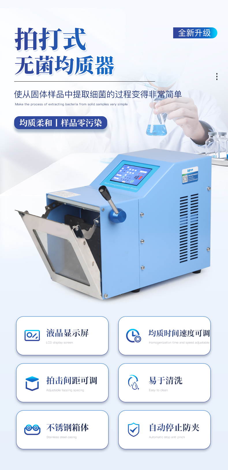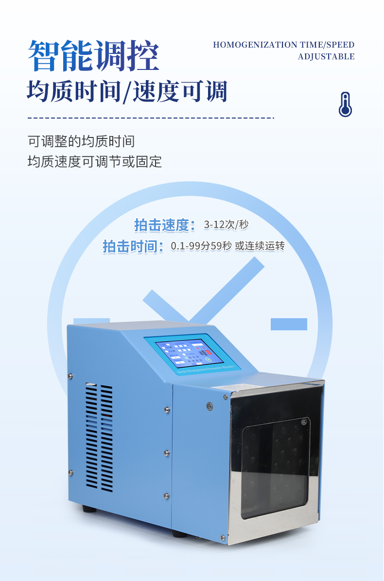 ●5英寸液晶顯示屏。 ●可儲(chǔ)存三組工作程序。 ●可調(diào)整的均質(zhì)時(shí)間。 ●均質(zhì)速度可調(diào)節(jié)或固定。 ●拍擊器可調(diào)整前后距離。 ●無(wú)菌一次性濾袋,保證衛(wèi)生。 ●全開(kāi)啟式門,易于清洗。 ●玻璃透明窗口易于觀察 。 ●樣品與均質(zhì)儀無(wú)接觸,如無(wú)樣品泄露則不需進(jìn)行系統(tǒng)清洗. ●均質(zhì)柔和、樣品零污染、無(wú)損傷、不升溫、不需要滅菌處理,不需洗刷器皿。