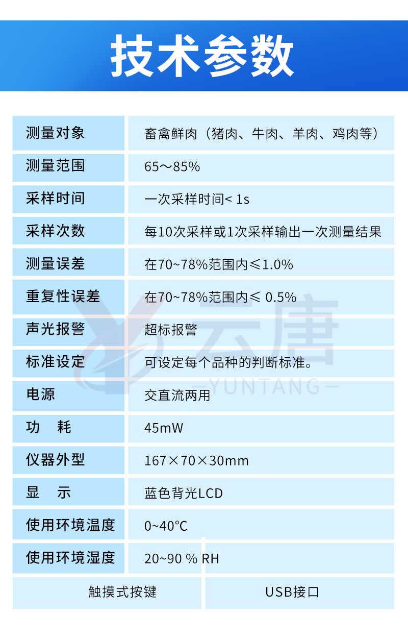 型號: YT-RLS肉類水分檢測儀產品簡介:肉類水分檢測儀主要用于快速豬肉、牛肉、雞肉等動物肉類水分含量,從而判斷所測樣品是否為注水肉,該儀器設計精巧,單手可持,儀器可根據測定對象的品種,設定相應的判斷標準值。YT-R···   更新時間:2026-03-03