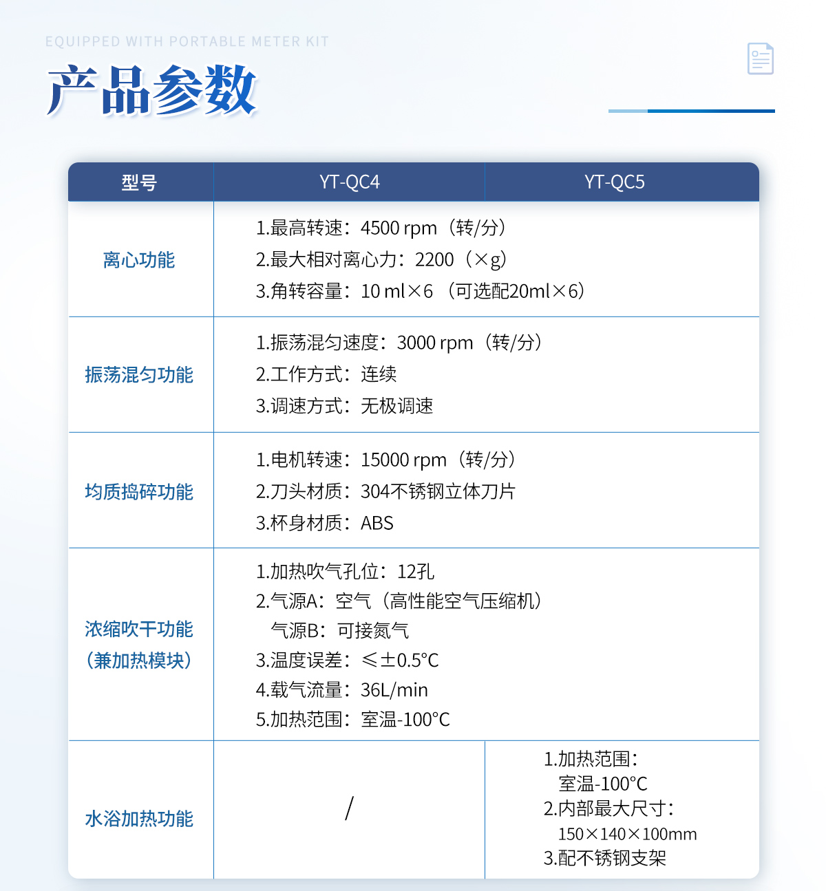 | 離心功能 1.**轉速:4500 rpm(轉/分) 2.**相對離心力:2200(×g) 3.角轉容量:10 mlx6 (可選配20mlx6) | 振蕩混勻功能 1.振蕩混勻速度:3000 rpm(轉/分) 2.工作方式:連續 3.調速方式:無極調速 | 均質搗碎功能 1.電機轉速:15000 rpm(轉/分) 2.刀頭材質:304不銹鋼立體刀片 3.杯身材質:ABS | 濃縮吹干功能(兼加熱模塊) 1.加熱吹氣孔位: 12孔 2.氣源A: 空氣(高性能空氣壓縮機) 氣源B: 可接氮氣 3.溫度誤差:≤±0.5℃ 4.載氣流量:36L/min 5.加熱范圍:室溫-100℃ | 水浴加熱 1.加熱范圍:室溫-100℃ 2.內部**尺寸:150mmX140mmX100mm 3.配不銹鋼支架 |