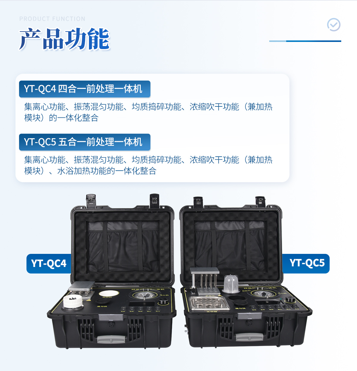 | 1、功能緊湊,集成五種樣品前處理常用的功能,完成樣品一站式處理。 | 2、結構穩固,機箱采用***工程塑料,具備**的抗沖擊性、耐腐蝕性、便攜性。 | 3、操作穩定,機器采用五寸全彩色液晶屏,功能指示性強,用戶操作均為實體開關,杜絕佩戴手套和液體噴濺時的操作失效。 |