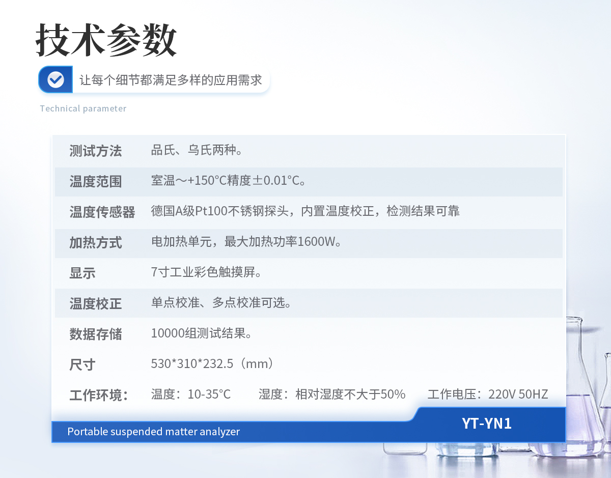 測試方法:品氏、烏氏兩種。    溫度范圍:室溫~+150°C精度±0.01°C。    溫度傳感器:德國A級Pt100不銹鋼探頭,內置溫度校正,檢測結果可靠。    加熱方式:電加熱單元,**加熱功率1600W。    顯示:7寸工業彩色觸摸屏。    溫度校正:單點校準、多點校準可選。    數據存儲:10000組測試結果。    尺寸:530*310*232.5(mm)    工作環境:    溫 度:10-35℃    濕 度:相對濕度不大于50%    工作電壓:220V 50HZ