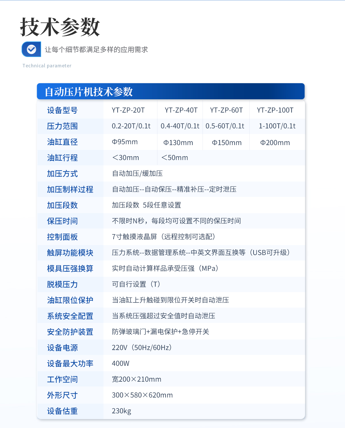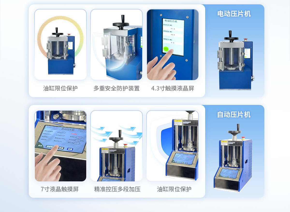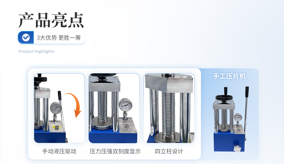 該機采用一體式結構,手動液壓驅動,兩立柱設計,具有造型美觀、操作方便、體積小巧、工作空間大等優點,非常適合拖進手套箱內使用;配上特定模具,可對各種粉末材料壓制成型,廣泛應用于科研、教學、檢測、催化、制藥等各個領域。