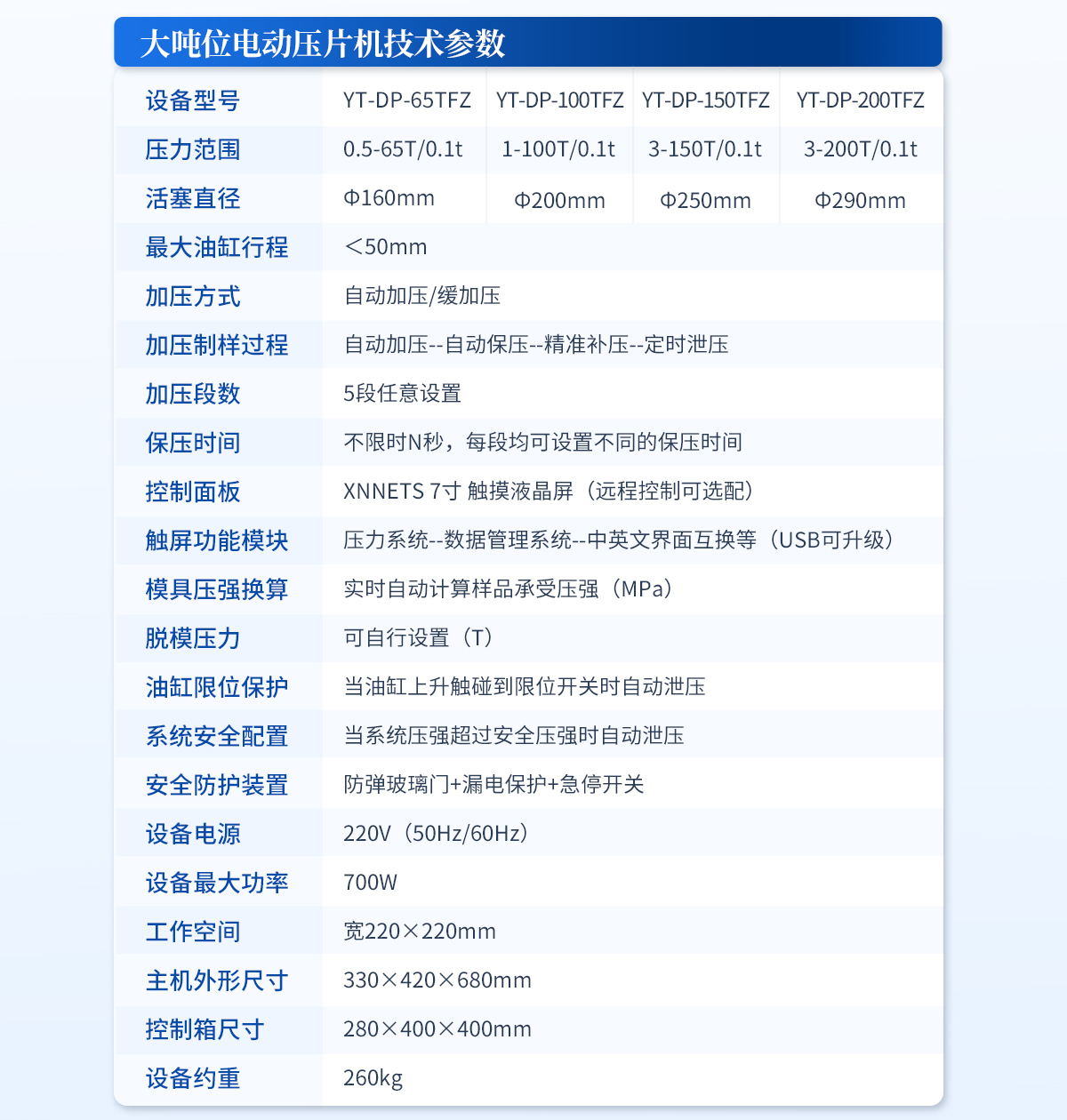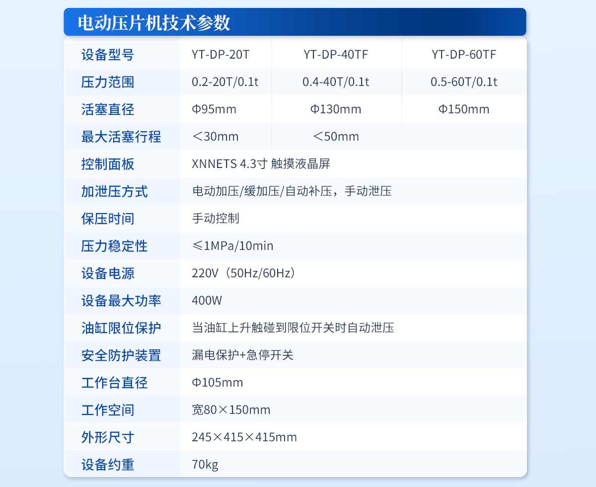 | 設備型號:YT-SP-12TA | 壓力范圍:0-12T/30MPa | 壓力換算:1MPa=0.4t | 活塞直徑 :Ф70mm | **活塞行程:<30mm> | 壓力表類型:指針型,壓力、壓強雙刻度顯示,顯示精度1MPa | 加泄壓方式:手動加壓/緩加壓,手動泄壓 | 壓力穩定性:≤1MPa/10min | 工作臺直徑:Φ80mm | 工作空間 :寬96×150mm | 外形尺寸 :230×160×380mm | 設備重量 :約28kg | 配置說明:壓片機1臺,模具選配,數顯表選配!可根據需求定制壓片機或模具 |