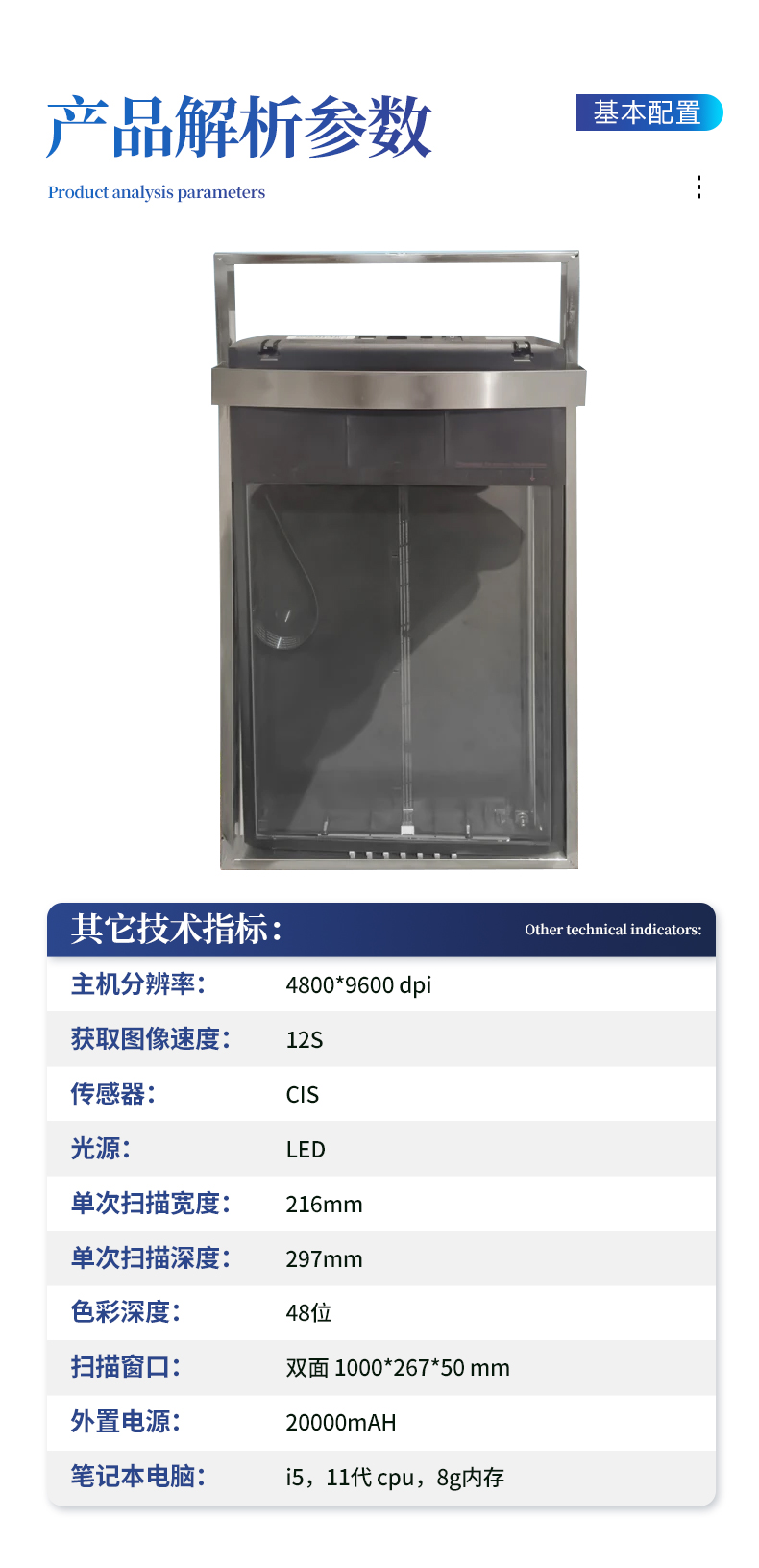 主機分辨率:4800*9600 dpi 獲取圖像速度:12S 傳感器:CIS 光源:LED 單次掃描寬度:216mm 單次掃描深度:297mm 色彩深度:48位 掃描窗口:雙面 1000*267*50 mm 外置電源:20000mAH 筆記本電腦:i5,11代 cpu,8g內(nèi)存